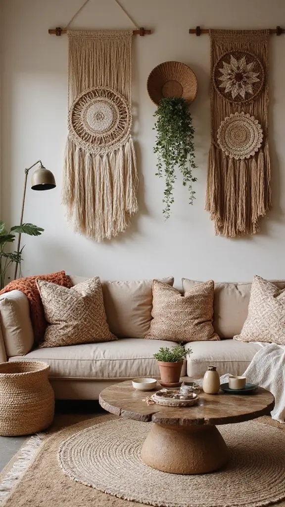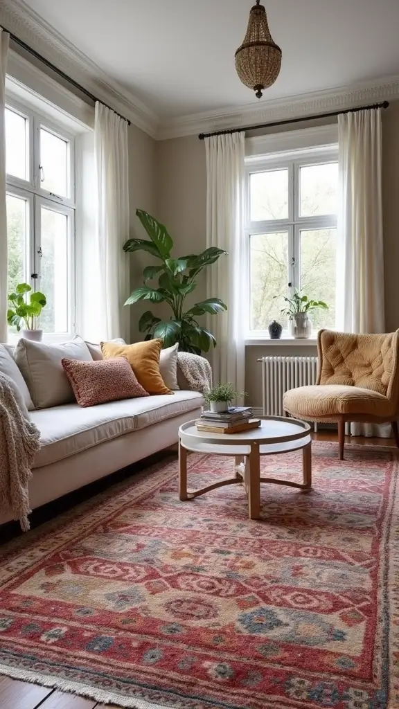 Layering rugs is a fantastic way to add warmth and depth to your living room, especially in smaller spaces. Start with a large, neutral base rug and layer a smaller, patterned one on top for a cozy, eclectic look. This technique not only enhances the bohemian style but also helps define different areas within your living space. This trend is popular among interior designers, creating inviting atmospheres.