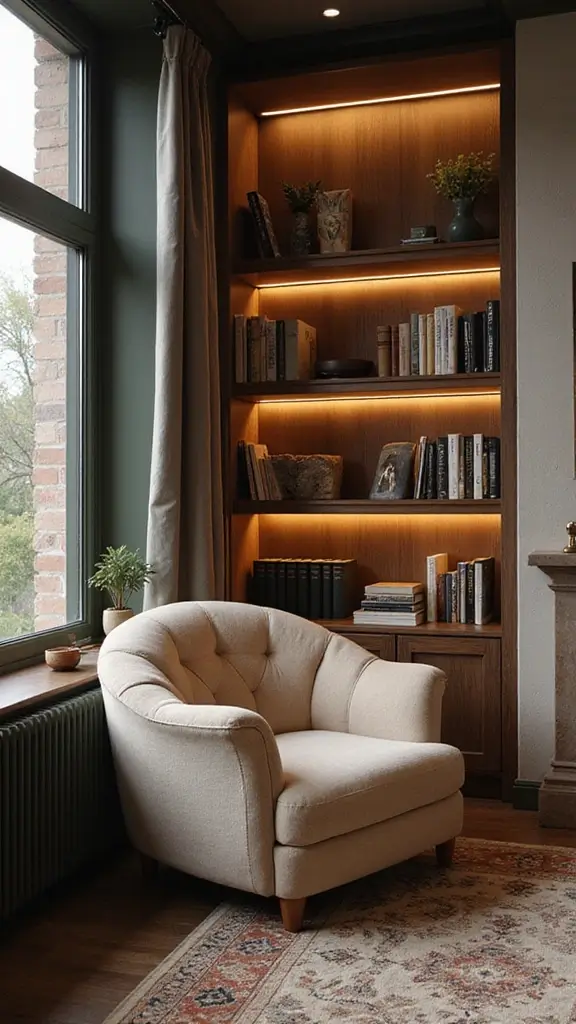 Creating a cozy corner nook in a small living room can make all the difference. Utilize vertical space with a corner shelf filled with books and plants to draw the eye upward, helping the room feel larger. A comfy chair, perhaps draped with a soft knitted throw, becomes the perfect reading spot. This design is all about comfort and style, perfect for relaxation.