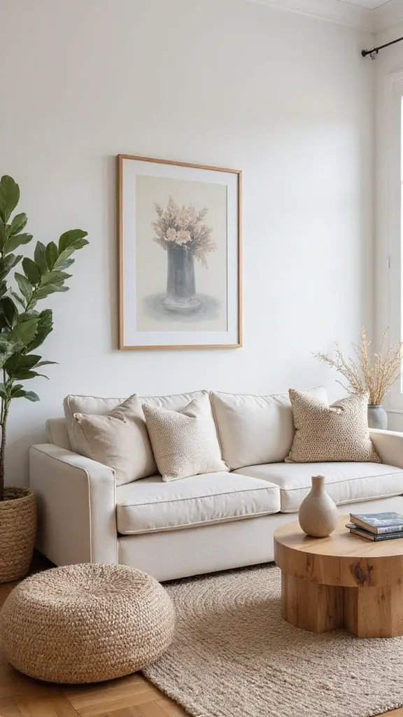 To make this design work for you, consider shopping at thrift stores or online marketplaces for budget-friendly options. Mixing textures adds depth without clutter, and incorporating plants can enhance the organic feel. This setup is perfect for unwinding after a long day, making your living room a true sanctuary.