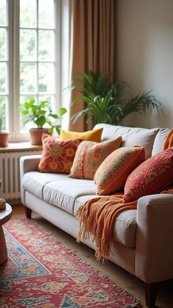 Bright throw pillows can instantly transform your boho living room with color and comfort. Select a variety of patterns and textures that reflect your unique style; rich colors like mustard, teal, and terracotta can energize the space. Mixing sizes creates dynamic layers that attract the eye and enhance coziness. This trend is perfect for adding personality without a lot of effort.