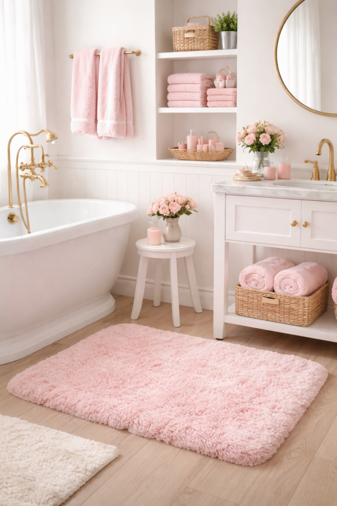 Rugs can completely change the feel of your bathroom! Choose a plush pink rug that adds comfort and color to the space. This is especially nice if you have cold tile floors. Layering rugs can create a unique look—try placing a larger neutral rug underneath a smaller pink one for added interest. The right rug can make your bathroom feel cozy and inviting. Look for rugs made from materials that are easy to clean and resistant to moisture for practicality. – Choose easy-to-clean materials for durability.