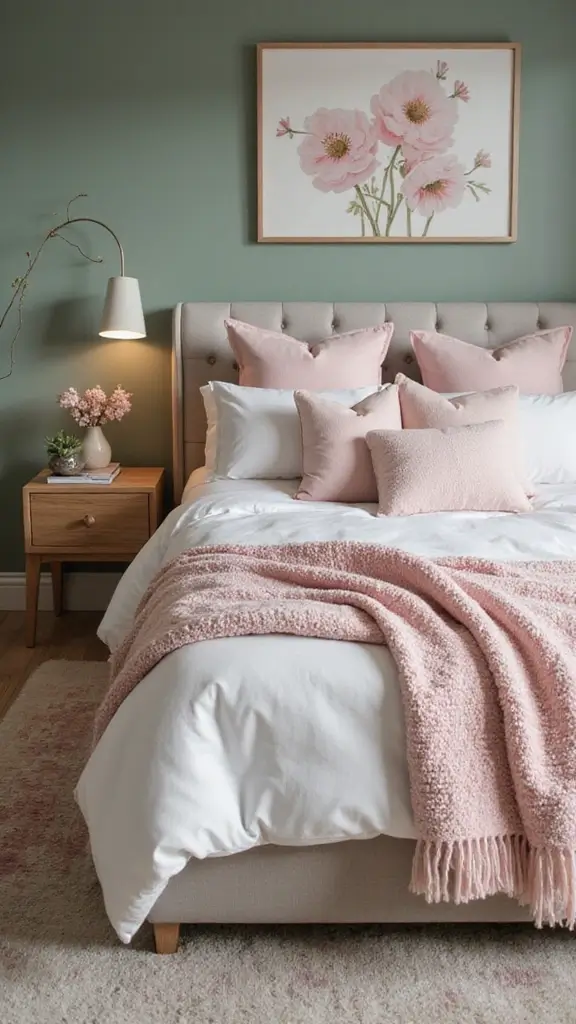 Mix soft blush pink with sage green for a romantic and dreamy bedroom. This combination balances the softness of blush with the coolness of sage, creating a warm and inviting space. Consider using blush accent pillows, a cozy throw blanket, and lamps in soft pink tones to tie everything together. A floral artwork featuring both colors can create a seamless blend, as seen in trending designs on Pinterest.