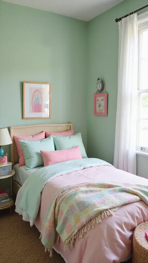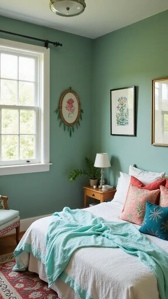 Embrace a nostalgic feel by combining sage green with retro colors like burnt orange and mustard yellow. This vintage-inspired palette offers a warm and inviting aesthetic, perfect for creating an eclectic space. Opt for retro-patterned wallpaper or fun accessories that bring character and charm to your bedroom.