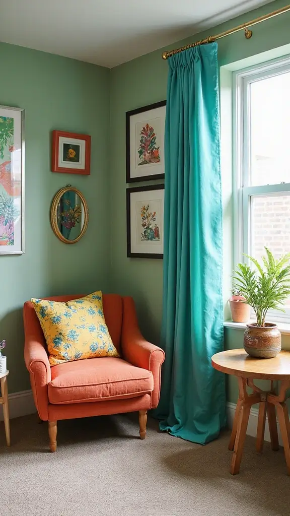 Use vintage finds like old lamps or furniture to enhance the retro vibe while keeping it authentic. Incorporate geometric patterns to keep the look lively and fun. Balance the bold colors with neutral furnishings to ground the decor and create harmony. This combination is ideal for those who love a unique and timeless style in their sanctuary.
