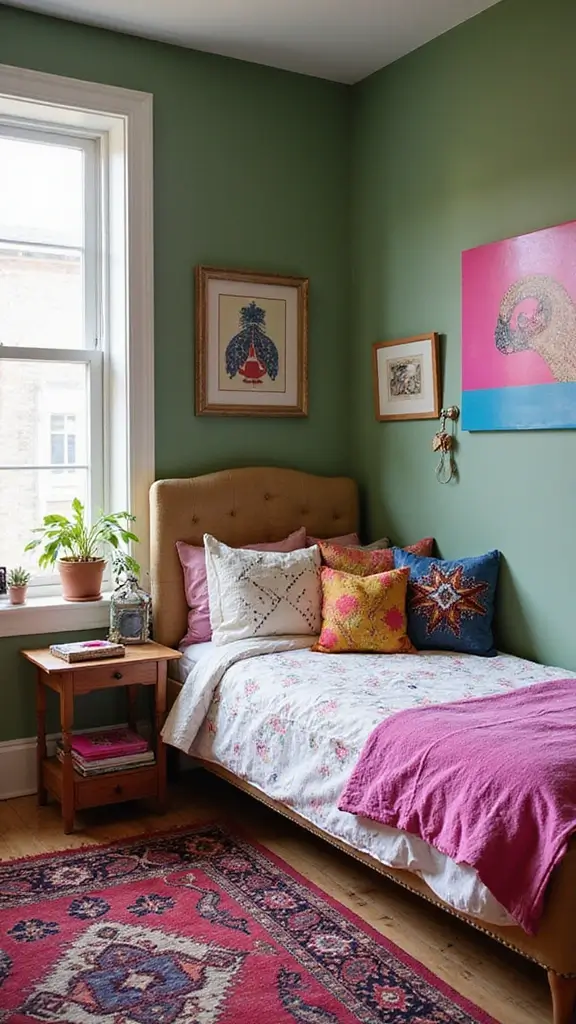 For a stylish approach, choose geometric patterns to bring a modern twist to the decor. Pair with neutral elements like white bedding to balance the bold colors. Have fun with accessories that reflect your personality, adding a playful touch. This setup is perfect for those who want a lively space that sparks joy and creativity.