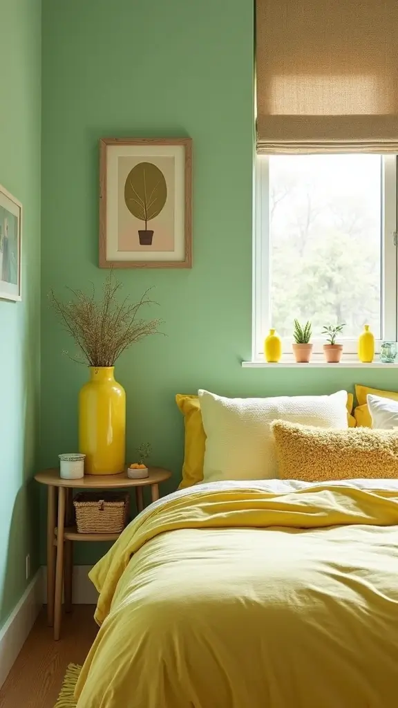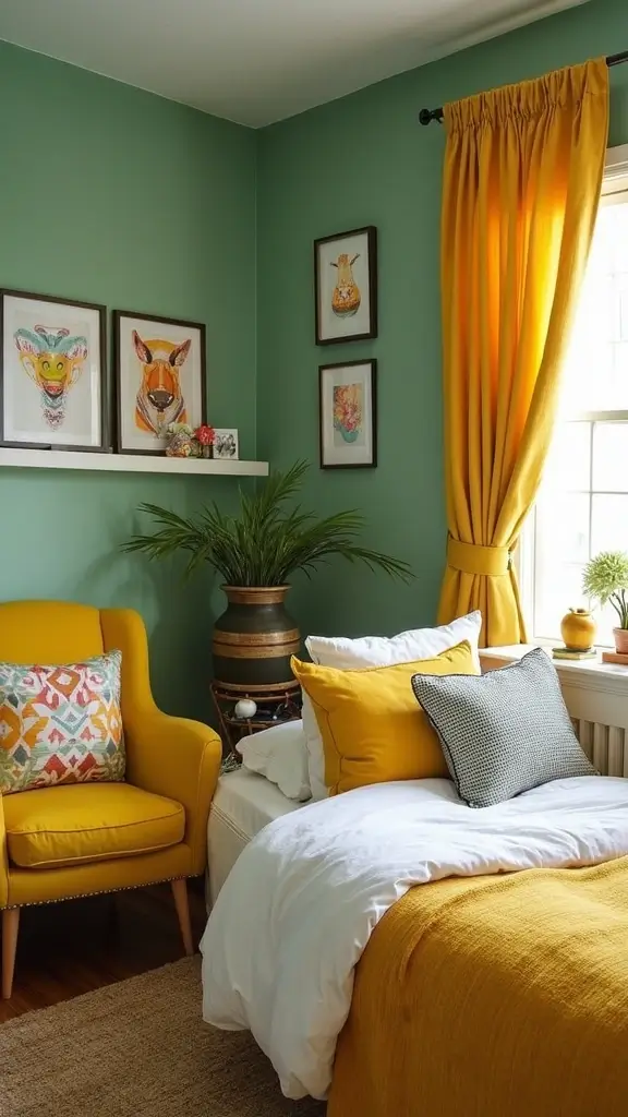 Keep the yellow accents minimal to maintain balance with the calming sage. Incorporate natural light with sheer curtains that enhance the sunny vibe. Simple patterns in pale yellows can maintain a light and airy feel throughout the room. This combination is perfect for those wanting to create a positive and warm environment in their bedroom.