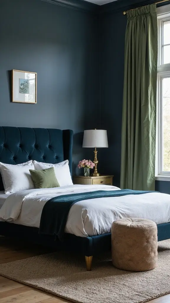 For a touch of elegance, pair sage green with stylish navy blue and gold accents. This combination creates a luxurious feel, perfect for a sophisticated bedroom. Use navy bedding or curtains and incorporate gold details in lamps or picture frames for added glamour.
