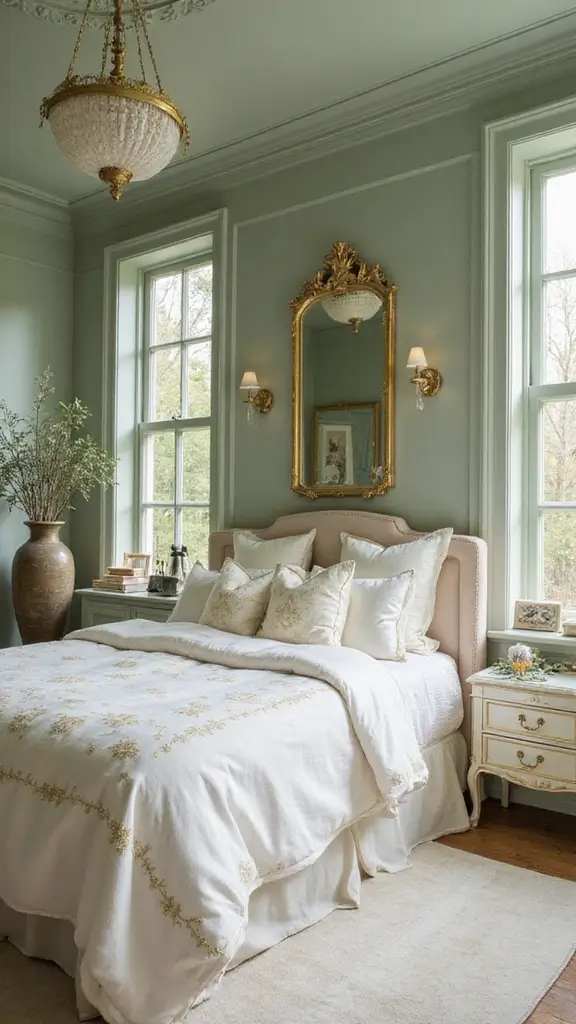 For a dreamy aesthetic, pair sage green with ethereal white and gold accents. This combination adds glamour while maintaining a serene vibe. Use white bedding with gold detailing and incorporate gold-framed mirrors or light fixtures to elevate the elegance of the space.