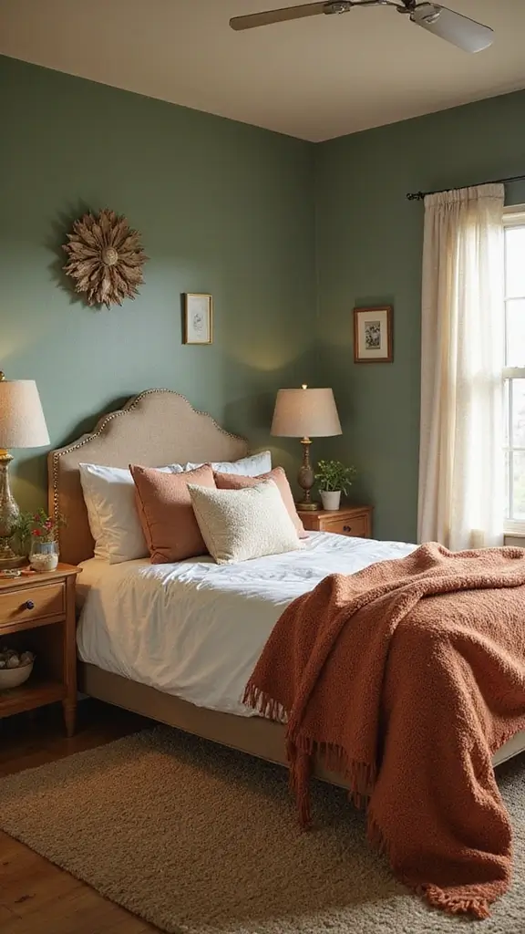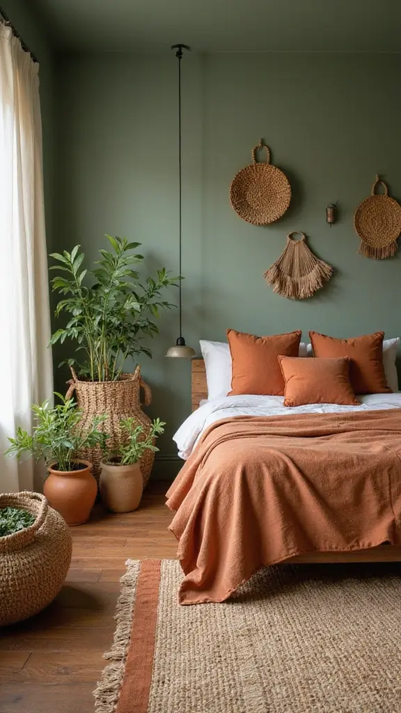 For a warm and earthy vibe, combine sage green with terracotta. This pairing creates an organic touch in your bedroom that feels grounded and inviting. Think about adding terracotta pots as decor or a cozy terracotta-colored rug to anchor the space beautifully.