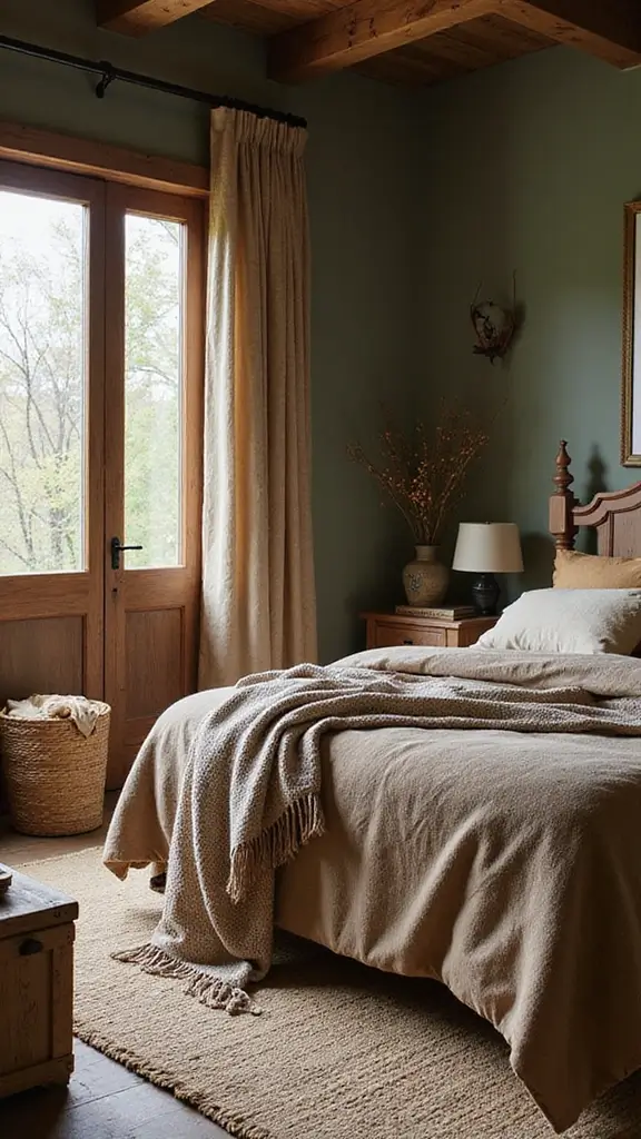 Use woven textiles, such as blankets or pillows, to enhance the rustic vibe. Incorporate nature-inspired decor elements like wooden sculptures or driftwood to connect with the outdoors. Balance the heaviness of brown with lighter sage shades in your linens for a harmonious look. This design works well for those who appreciate a cozy, inviting space ideal for relaxation.