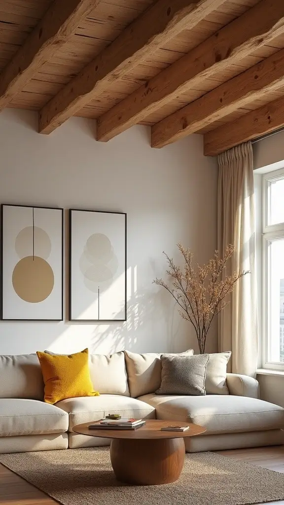 If your home lacks these beams, consider faux options for a similar rustic effect. Pair them with bright decor to create a vibrant contrast that enhances your space. This mix of dark wood and lively colors can truly elevate the overall aesthetic.
