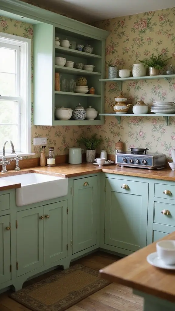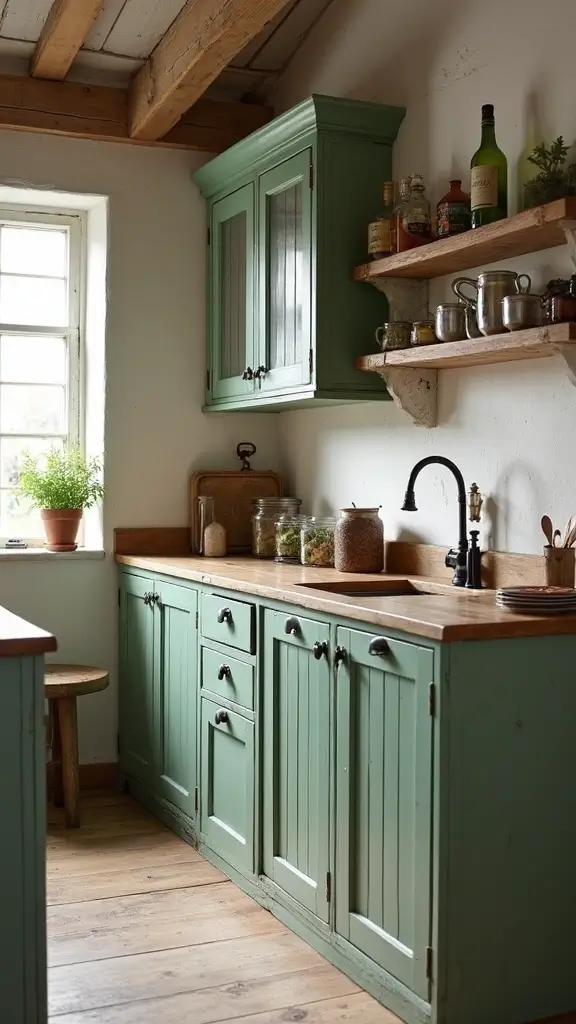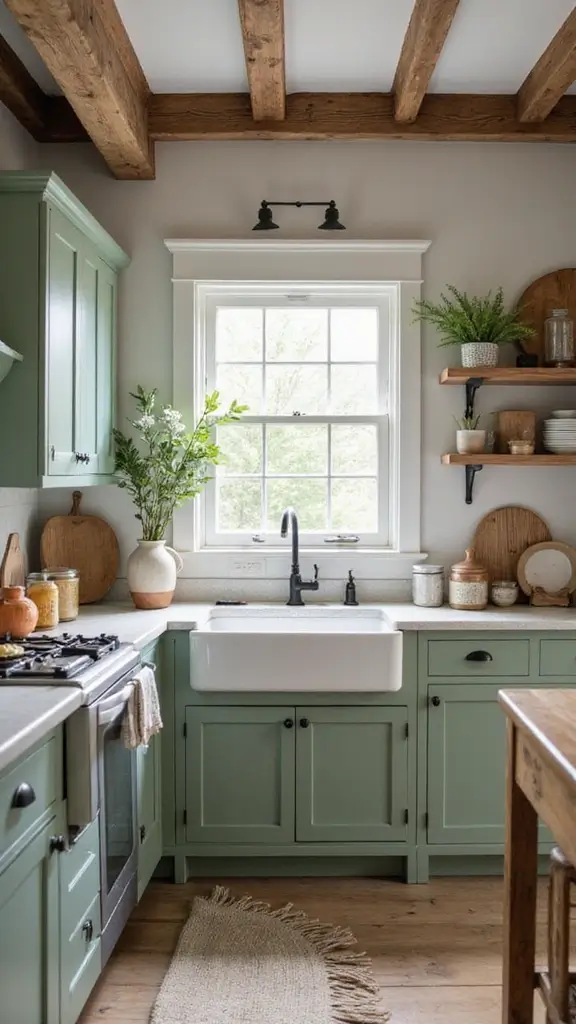 To achieve this look, choose vintage-inspired knobs and handles that complement the rustic theme. Open shelving can display your favorite dishware, adding both function and style. Balance the cool tones of sage green with warm wooden accents to create a harmonious vibe. This design is ideal for family gatherings, making your kitchen feel welcoming and full of life.
