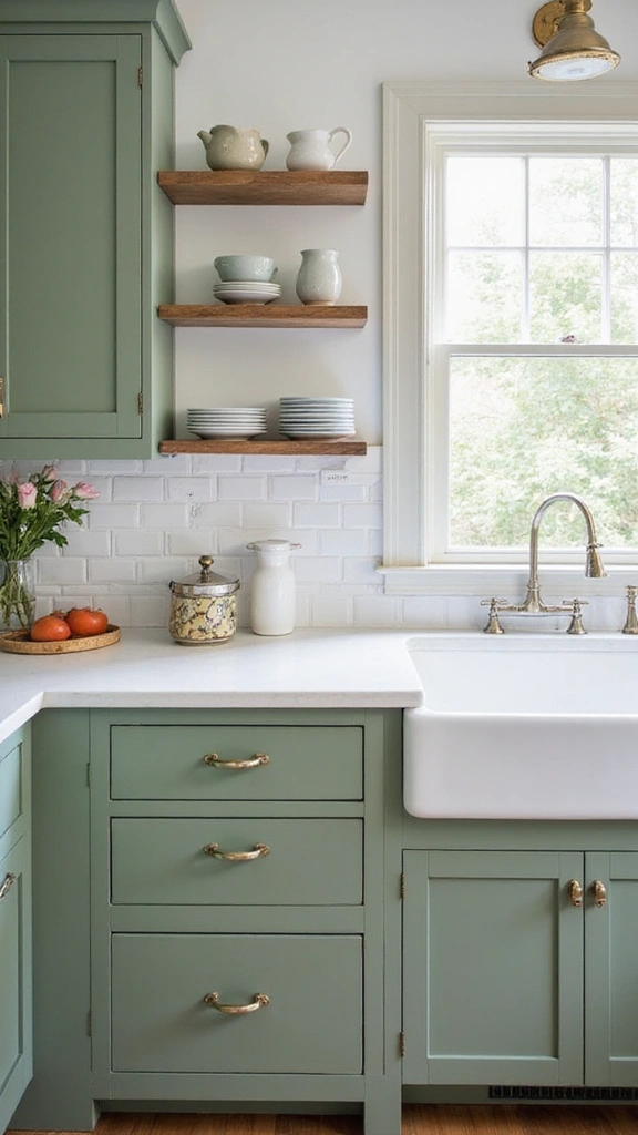 Experience timeless appeal with sage green cabinets paired with classic white elements. This combination looks fresh and stylish, never going out of fashion. Picture a white countertop or backsplash providing a bright contrast that enhances the overall design.