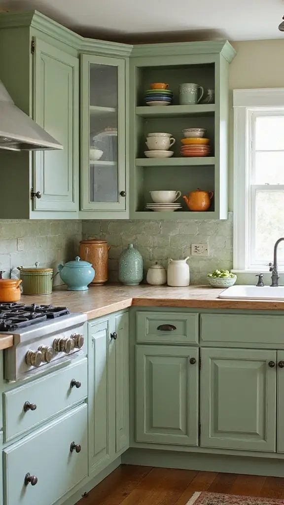 For an eclectic mix, pair sage green cabinets with bold accent colors like deep reds or bright yellows. This vibrant approach showcases a fun personality and a daring spirit. Think about colorful backsplashes that create playful energy in your kitchen.