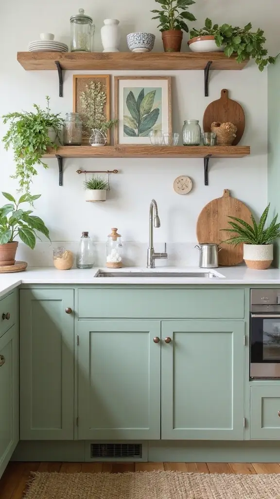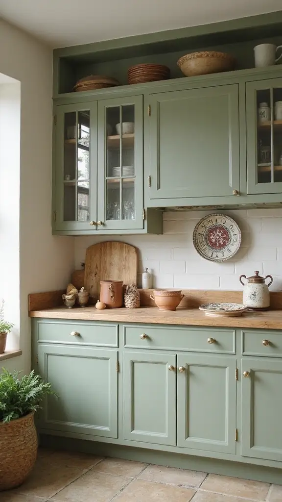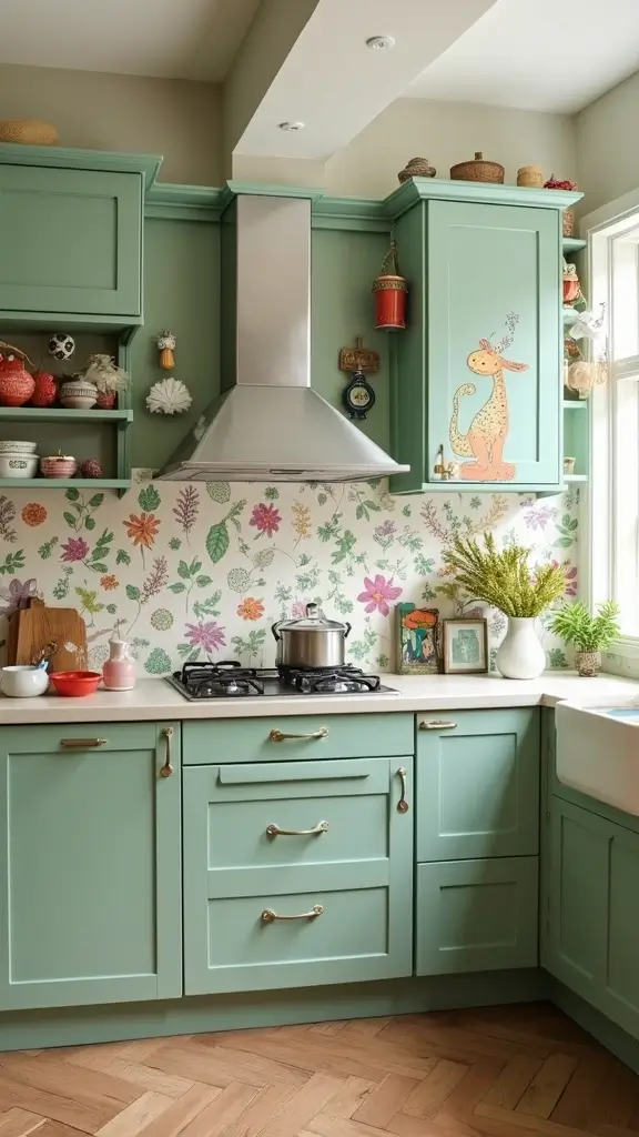 Add a whimsical touch to your kitchen with sage green cabinets paired with playful accessories. Fun motifs and colorful accents can make your cooking space feel lively and inviting. Picture quirky decor items like colorful dish towels or funky art pieces brightening up the room.