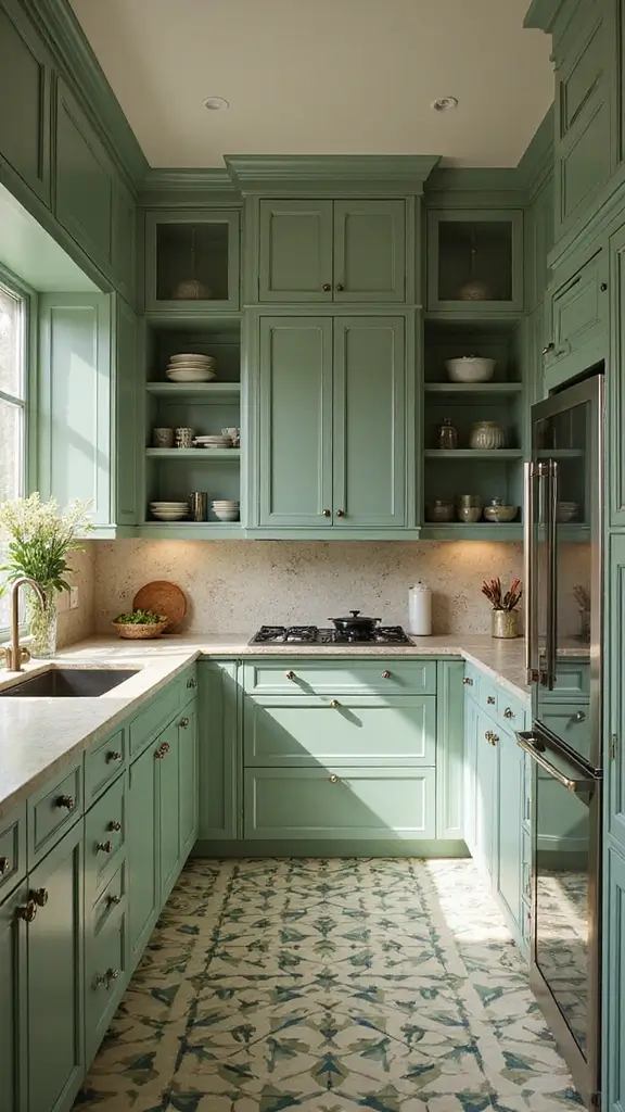 Infuse your kitchen with Art Deco inspiration through sage green cabinets that speak glamour and sophistication. This style is marked by bold geometric patterns and rich colors, creating a luxurious kitchen space. Imagine sleek, shiny hardware enhancing the opulent feel of your kitchen.