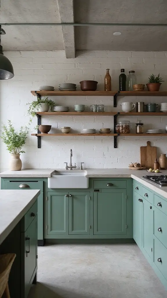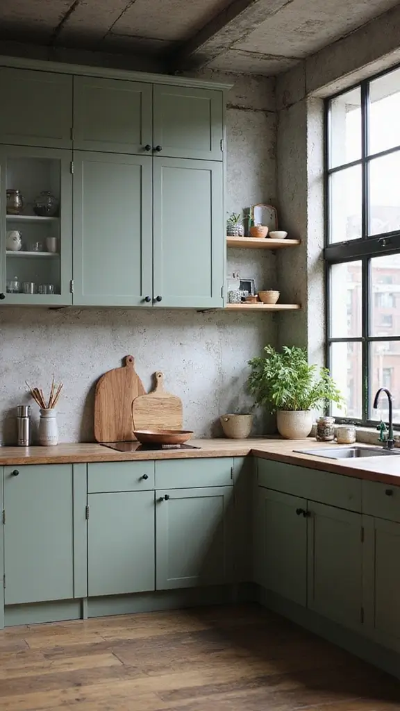 Industrial chic merges raw and refined elements, making sage green cabinets a bold focal point. Mixing materials like metal, wood, and concrete creates a stunning kitchen space. Imagine using concrete countertops alongside sage green for a modern yet trendy look.