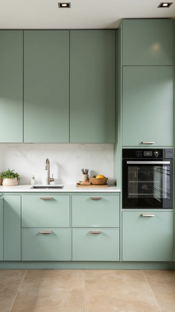 If you love a minimalist approach, sleek sage green cabinets can transform your kitchen into a chic retreat. This style focuses on clean lines and simplicity, often enhanced by metallic hardware and understated decor. Imagine how stainless steel appliances can beautifully contrast with the soft sage hue, creating a modern look that feels fresh and inviting.