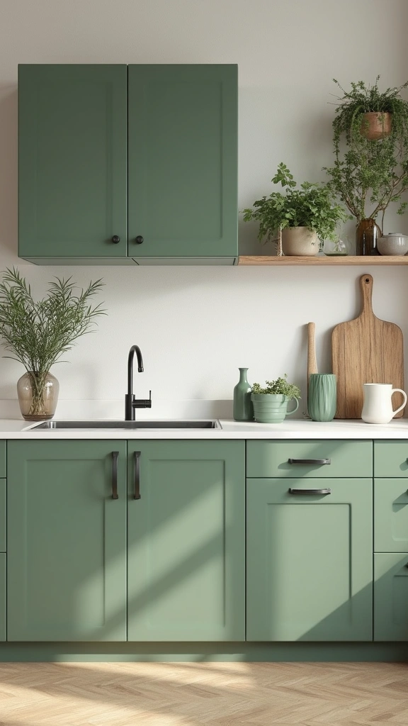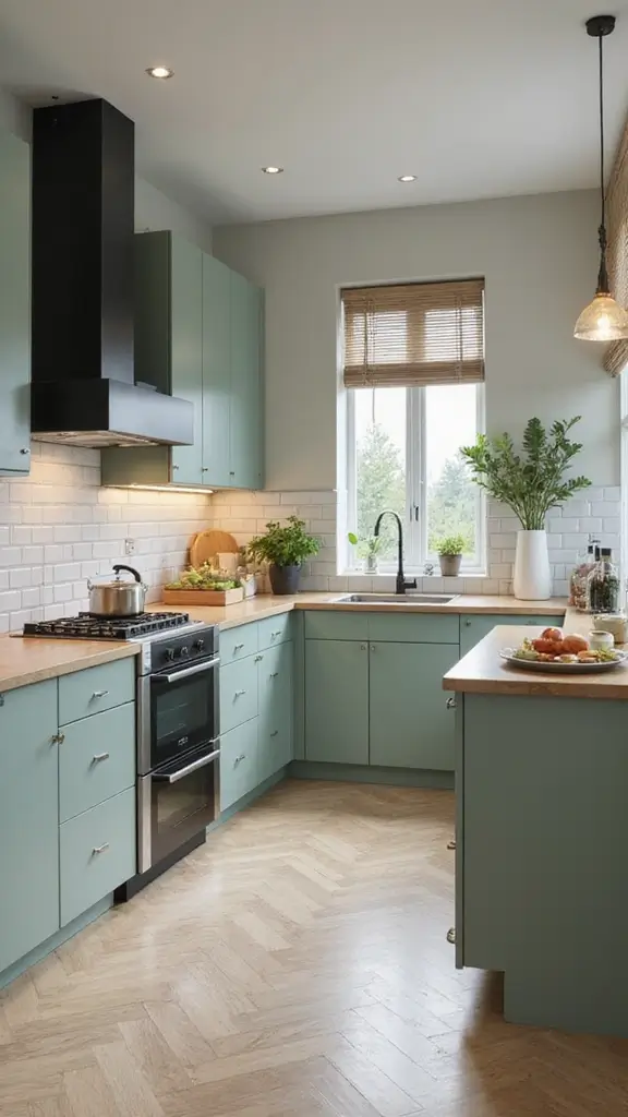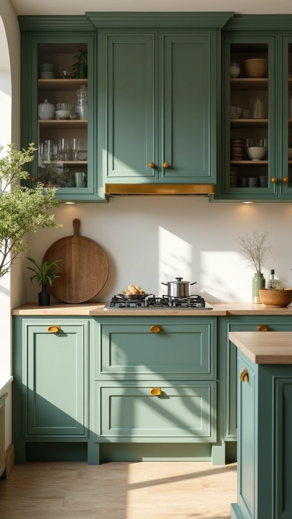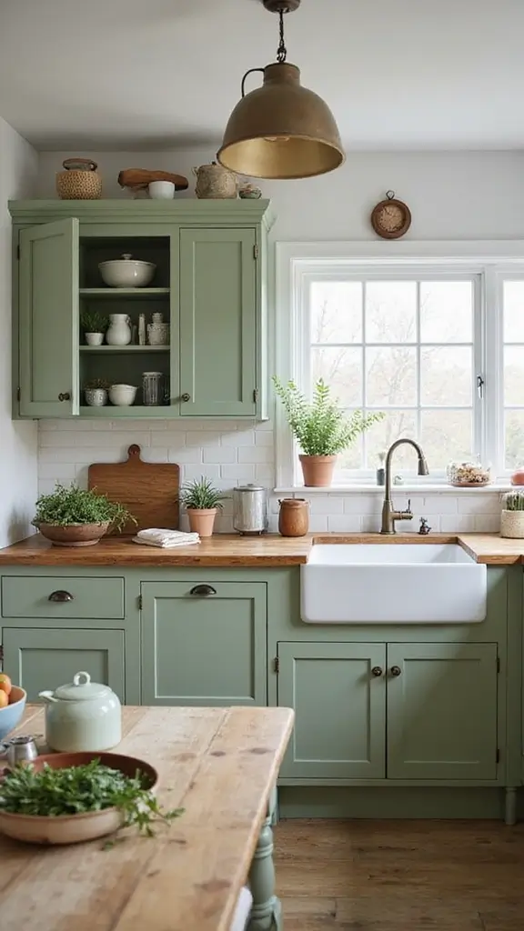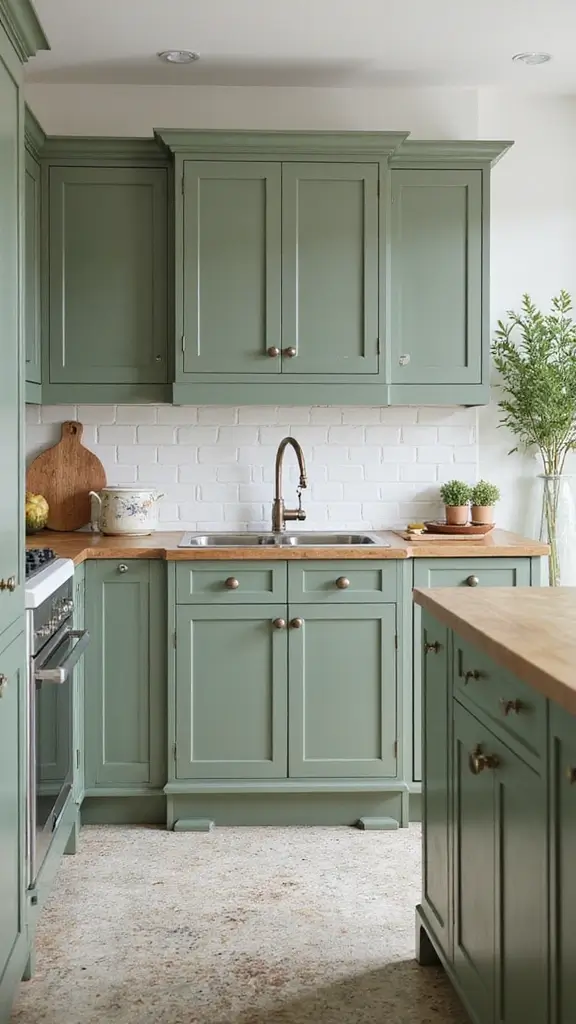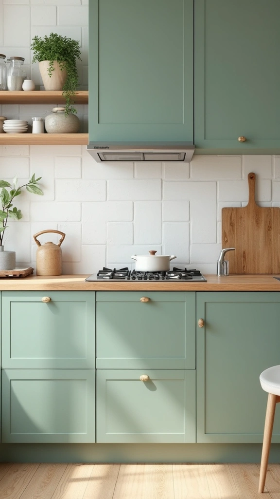 Create a sense of earthy elegance with sage green cabinets accented by natural wood. This pairing brings warmth to your kitchen, making it feel like a serene retreat. Picture wooden countertops or a rustic island that adds texture and comfort, alongside terracotta pots filled with fresh herbs.