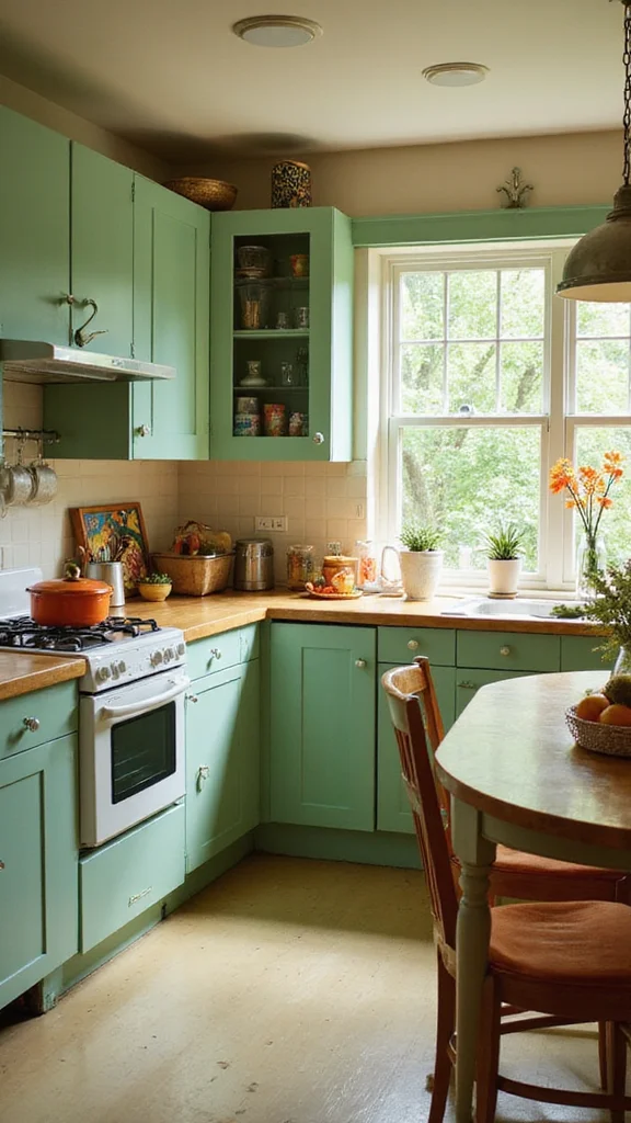 Take a trip down memory lane with a retro revival featuring sage green cabinets inspired by the vibrant 70s. This fun style resonates with nostalgia while adding a modern twist. Think about bold patterns, such as geometric tiles or wallpaper, that enhance the retro vibe.