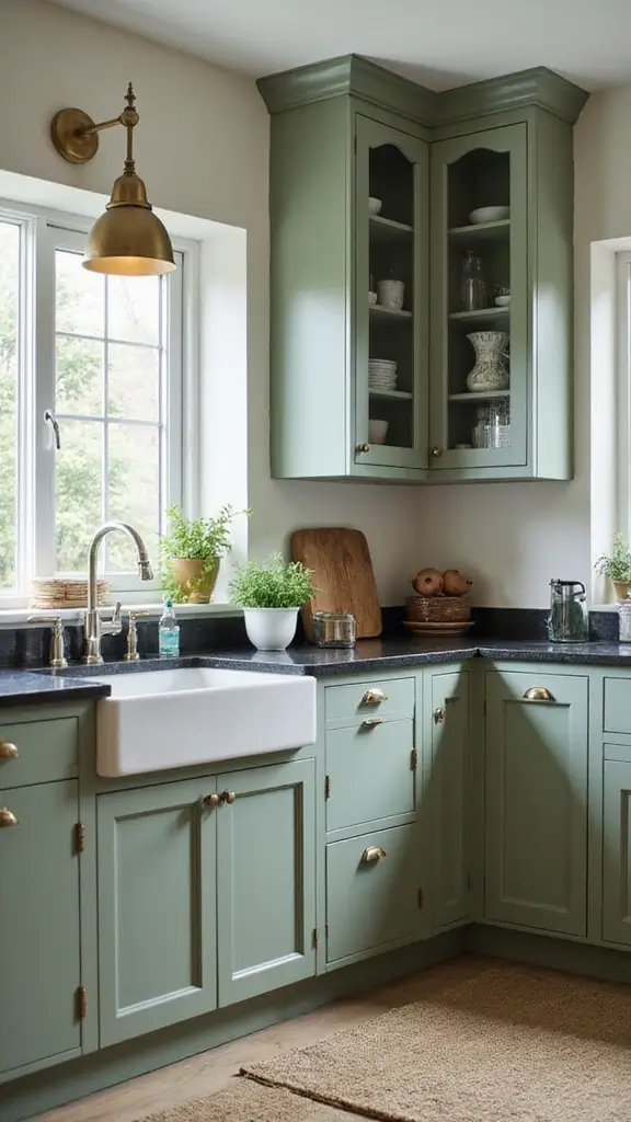 Glamorous touches can elevate sage green cabinets to new heights. Incorporating gold hardware and accessories instantly adds a luxe feel to your kitchen. Picture cabinet handles and faucets in brass or gold that stand out against the soft green, creating a chic contrast.