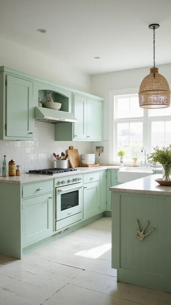 Bring coastal vibes into your kitchen with light sage green cabinets that evoke the freshness of the sea. Pair these with crisp white accents, creating a bright and airy atmosphere that feels inviting. Imagine using nautical decor like seashells and ropes to enhance the beachy theme.