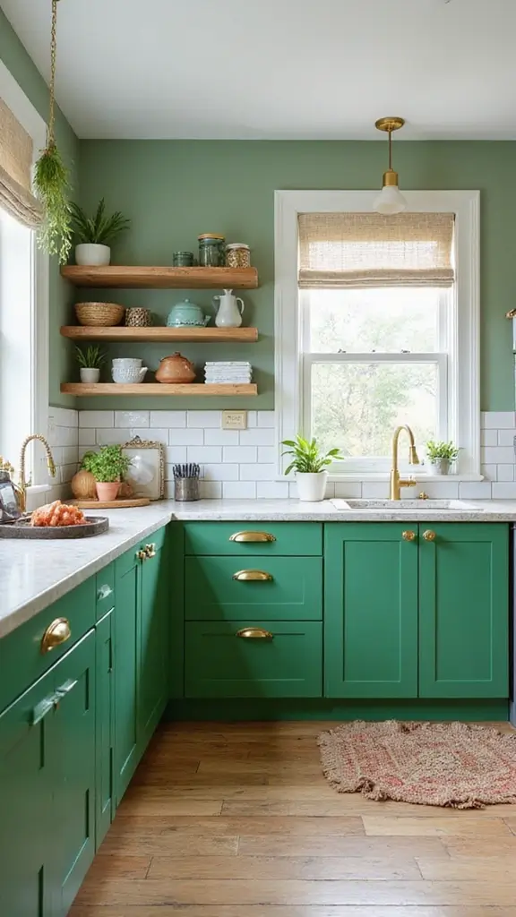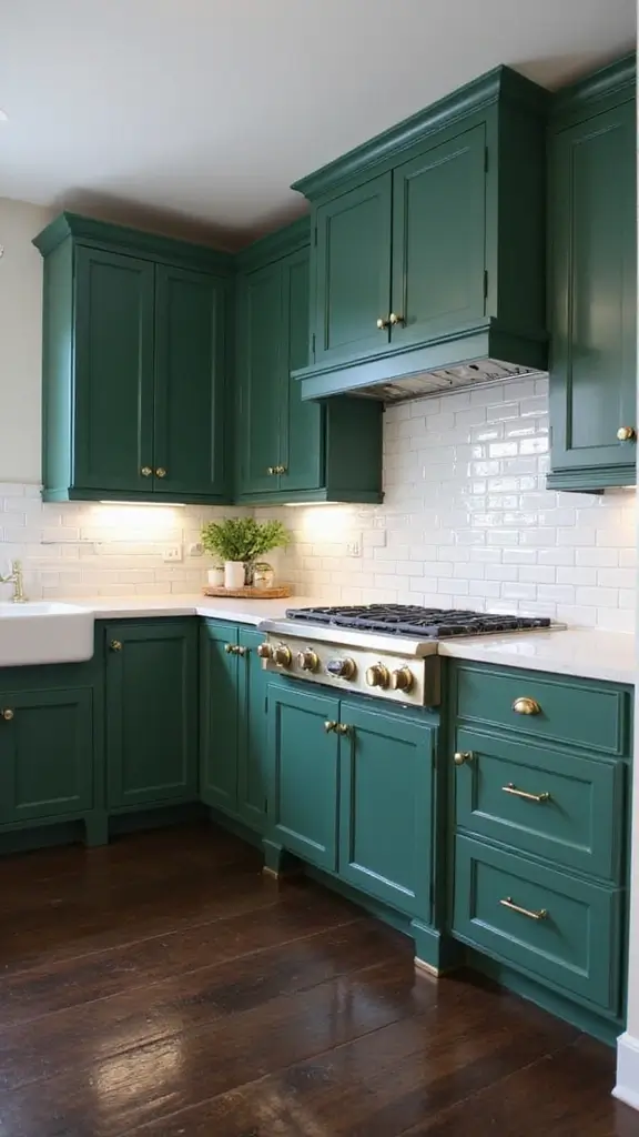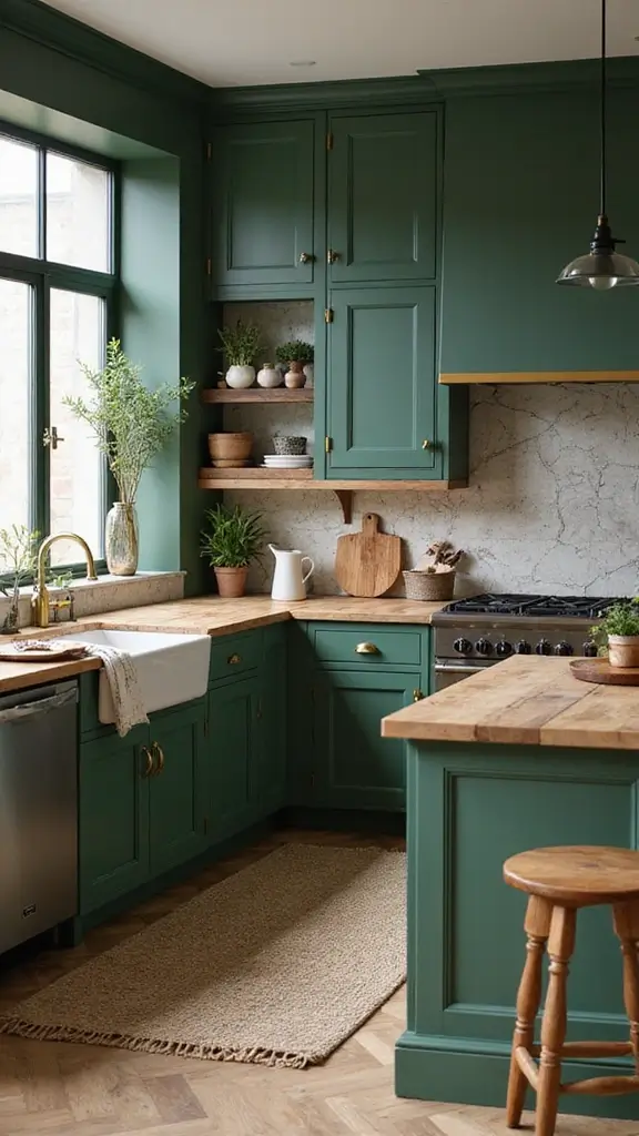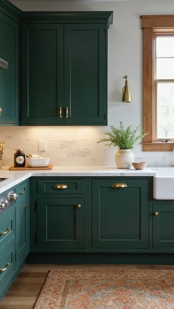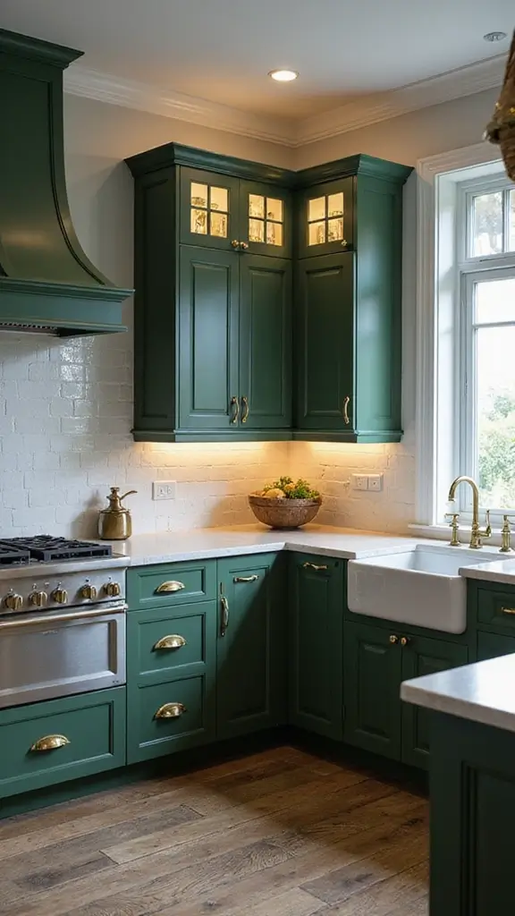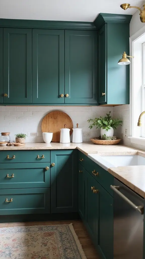 Deep forest green cabinets create a welcoming, classic kitchen vibe. This rich color pairs beautifully with antique gold handles, giving off a vintage charm that feels cozy and timeless. You’ll find this trendy combination featured often on Pinterest, where it inspires many to create inviting spaces for family gatherings.