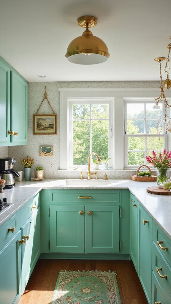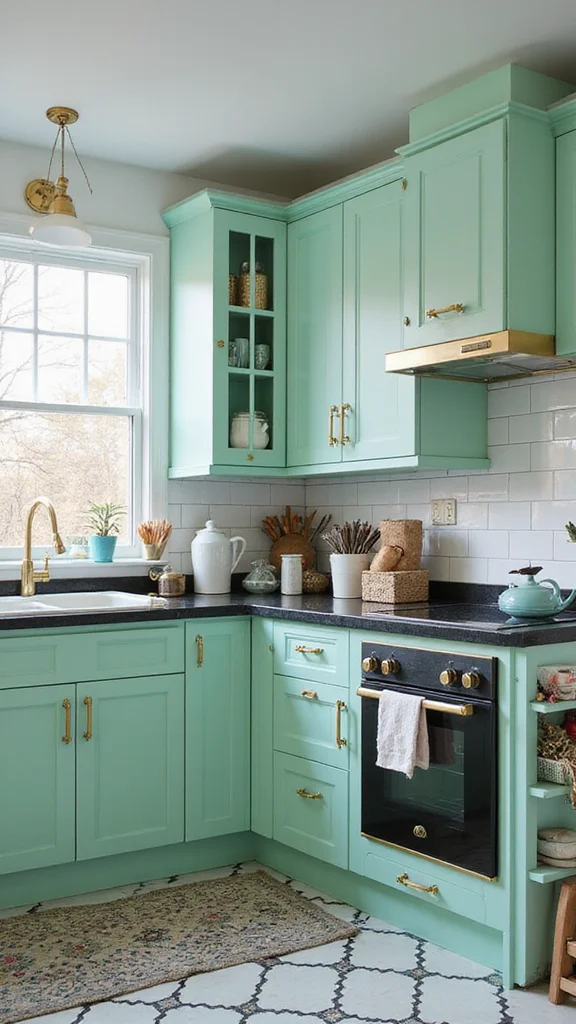 Mint green cabinets add a playful and cheerful touch to your kitchen. When paired with glossy gold handles, this combination brings a lively energy that makes cooking and entertaining fun. The refreshing hue offers a splash of vibrancy without overwhelming the senses, as seen in modern design trends.