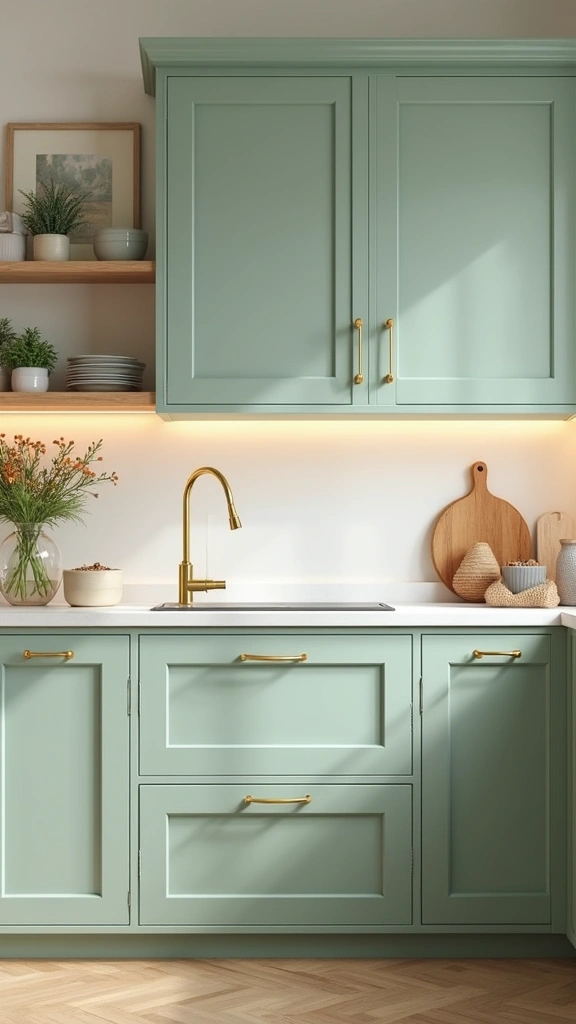 Pale celadon green cabinets offer a soft, soothing ambiance for any kitchen. Paired with elegant gold handles, this combination feels both classic and chic. This pastel color works beautifully in various styles, from modern to traditional.