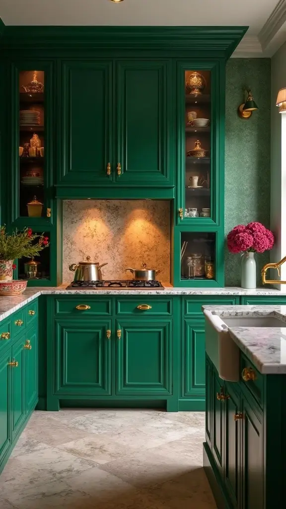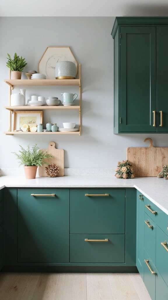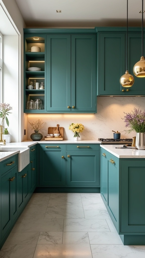 Emerald green cabinets exude luxury and depth, providing a dramatic backdrop for any kitchen. When paired with brass handles, this combination adds a touch of opulence that radiates sophistication. This bold choice transforms your kitchen into a statement space, perfect for those who appreciate style.