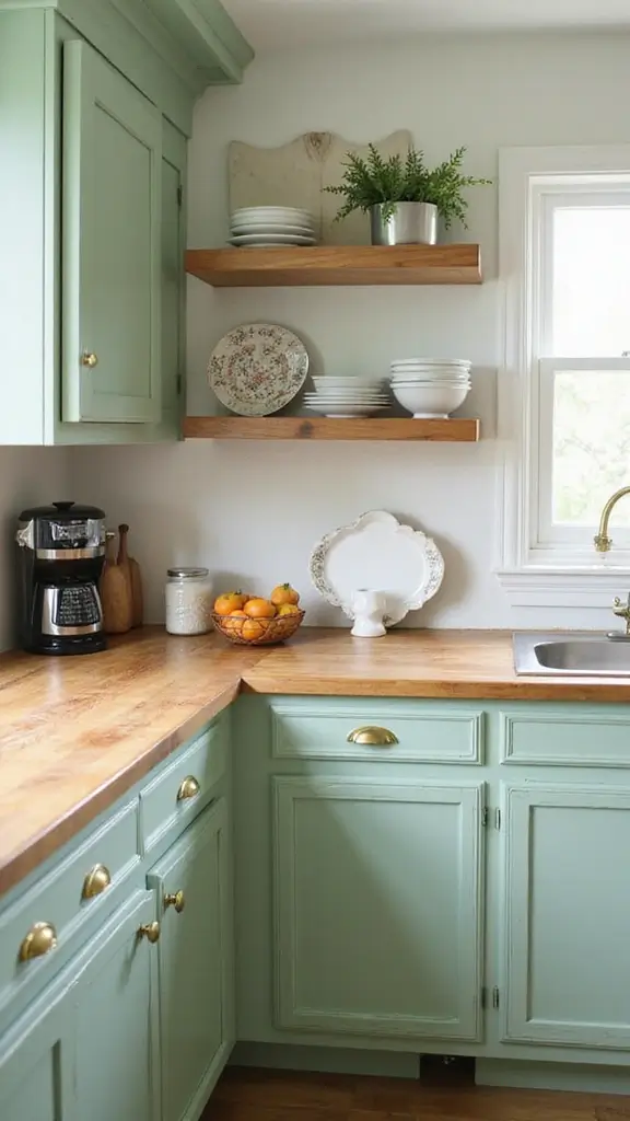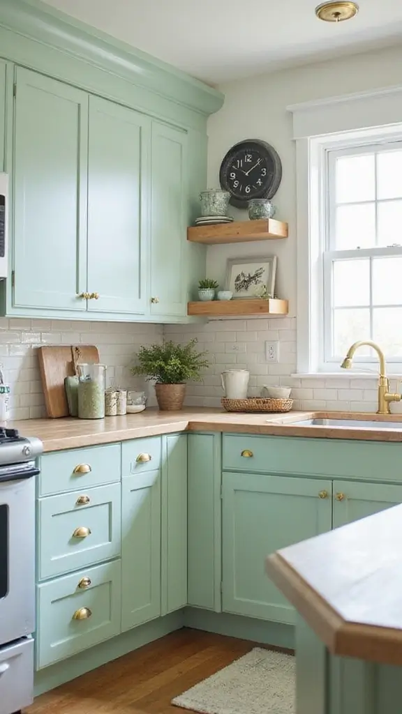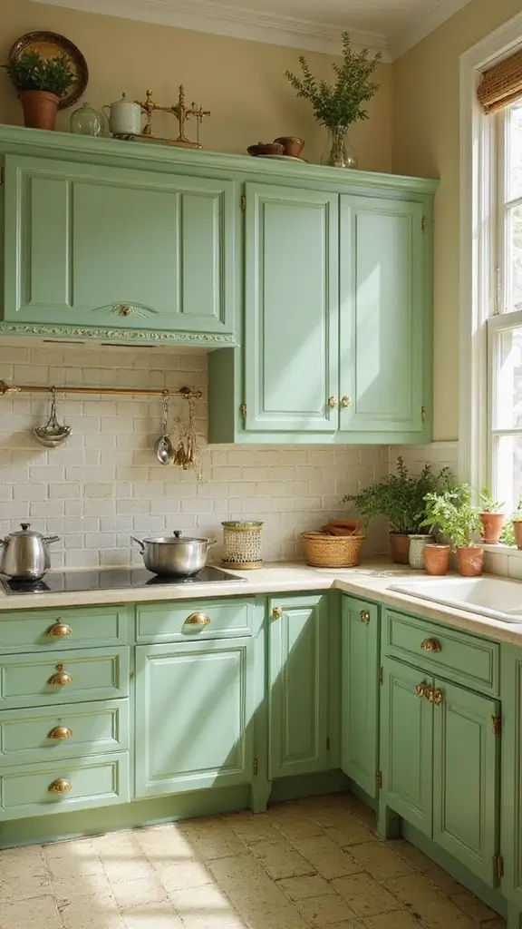 Light green cabinets evoke freshness and creativity in your kitchen. Pairing them with vintage gold handles adds nostalgic charm to the space, making it perfect for cottage-style kitchens. This combination creates a homey feel that’s inviting and warm.