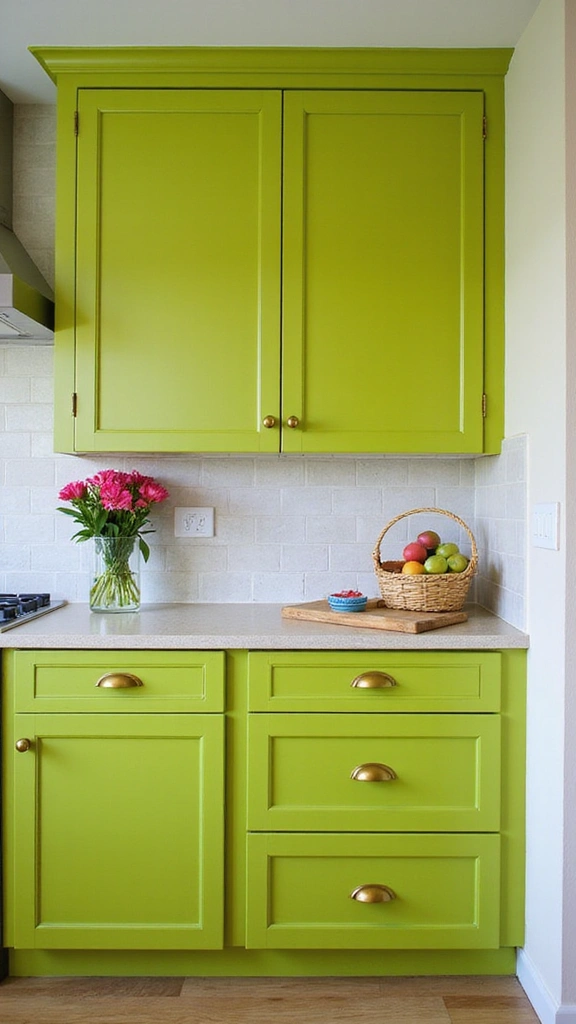 Bright lime green cabinets make a bold statement in any kitchen. Paired with gold pulls, this lively color injects energy into the space, creating a fun and inviting atmosphere for cooking and entertaining.