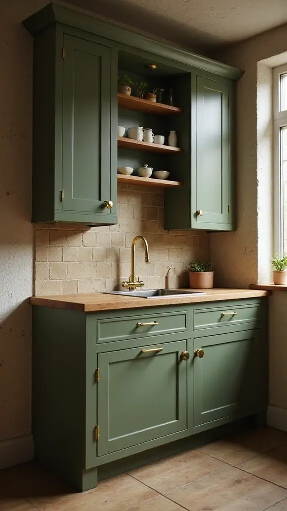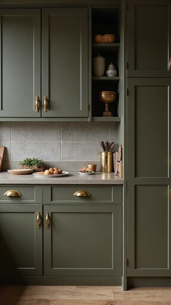 Olive drab cabinets offer a military-inspired, earthy vibe that pairs beautifully with polished gold hardware. This combination creates a dramatic and unique aesthetic for those with bold design choices.