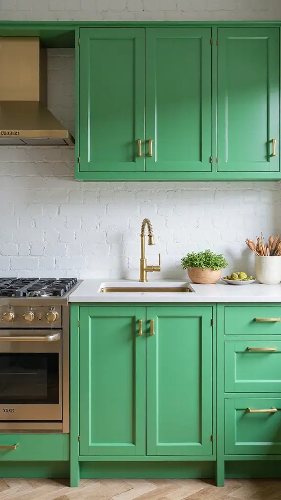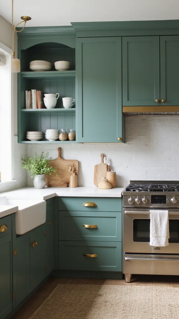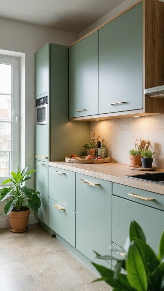 Jade green cabinets add a splash of color while maintaining a tranquil and sophisticated feel. Pairing them with contemporary gold handles provides a modern twist, making your kitchen stylish and inviting. This color is perfect for urban or modern homes looking for a fresh update.
