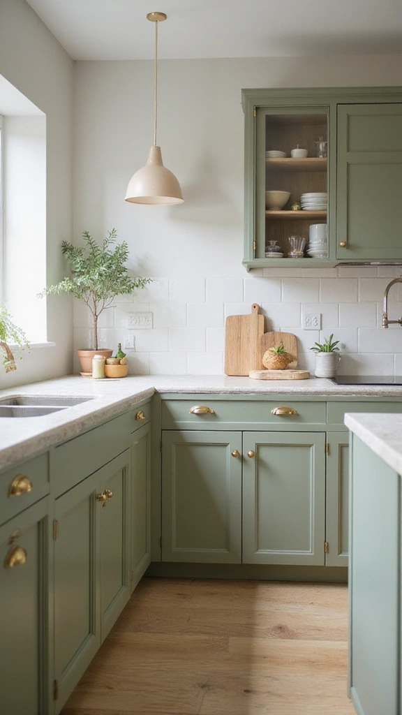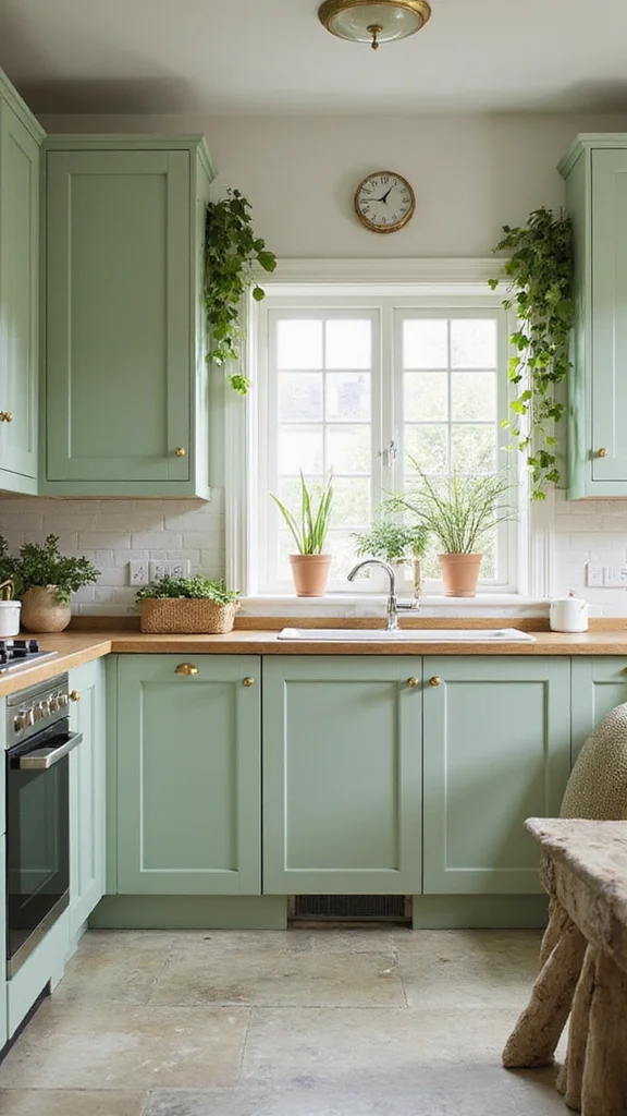 To implement this look, pair sage green with natural wood elements for a rustic touch. Light, airy curtains will let in natural light, enhancing the soothing green tones. This approach makes your kitchen feel inviting and relaxed, ideal for family meals and gatherings.