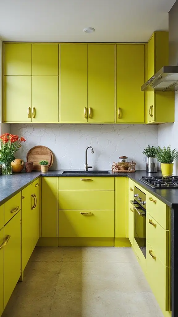 Bright chartreuse cabinets are perfect for bold decorators! This daring color makes a statement and shines even brighter with chic gold accents. Ideal for modern or eclectic kitchens, this combo is a fun choice for adventurous styles.