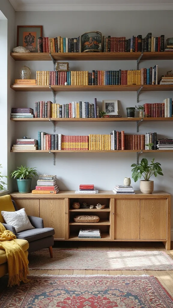 For a budget-friendly option, consider DIY floating shelves from wood or repurpose old shelves. Mix books with decor items like candles or small plants for a balanced look. With floating shelves, you’ll keep your space organized while expressing your unique taste.