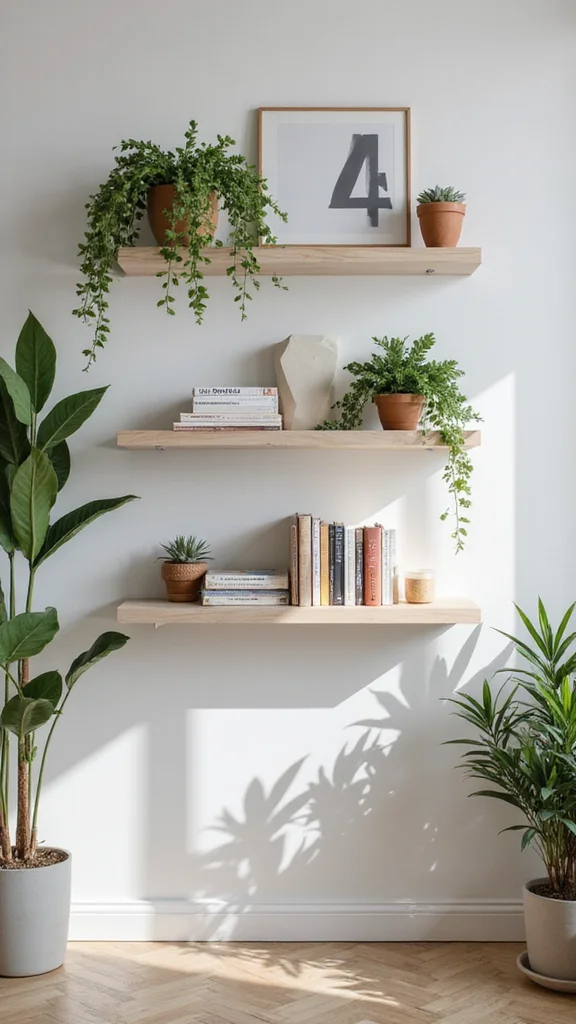 Another great option is to use floating shelves to display plants, books, or decorative items. These not only fill the space but also add depth and character to your walls!