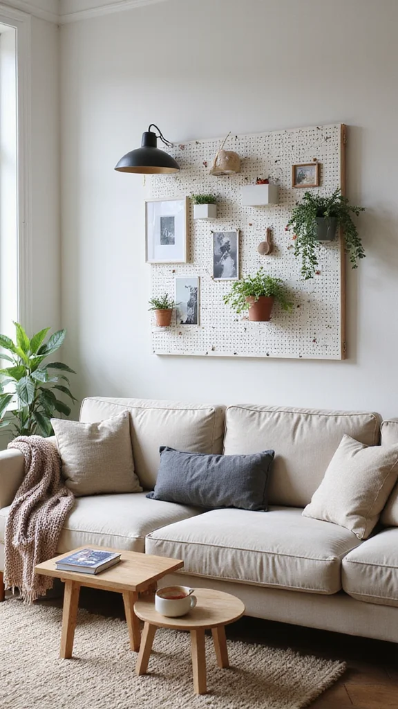 Pegboards aren’t just for tools; they can be a stylish decor solution in your living room! These versatile boards let you display and organize items creatively. Use them to hang photos, plants, or art pieces, forming a unique gallery wall.