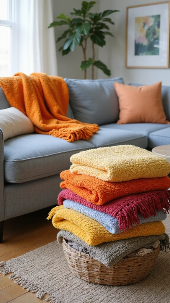 Throw blankets can bring warmth and color to your living room. Drape a vibrant throw over your sofa or chair to create a cozy focal point. Choose colors and patterns that complement your existing decor.