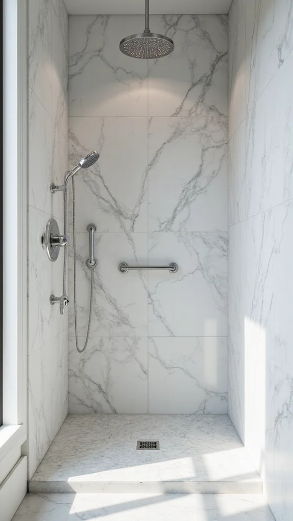To make the most of your marble tiles, consider using larger pieces to minimize grout lines. This not only enhances the sleek look but also saves you on maintenance. Pair them with simple fixtures in chrome or matte black for a chic contrast. Keep your decor minimal to allow the tiles to shine, making your shower feel like a personal retreat.