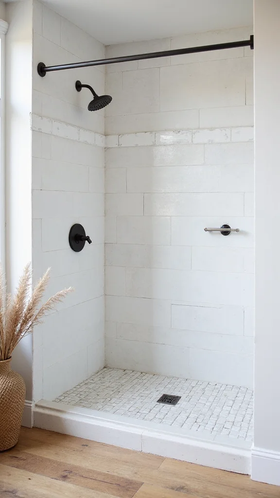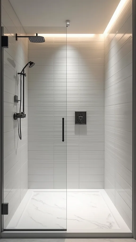For a sleek appearance, choose larger subway tiles to minimize grout lines. Pair them with soft lighting to enhance their glossy finish. Keeping hardware minimal will keep the focus on the gorgeous tile design. A small shelf can be added for essentials while maintaining a clean, clutter-free look.