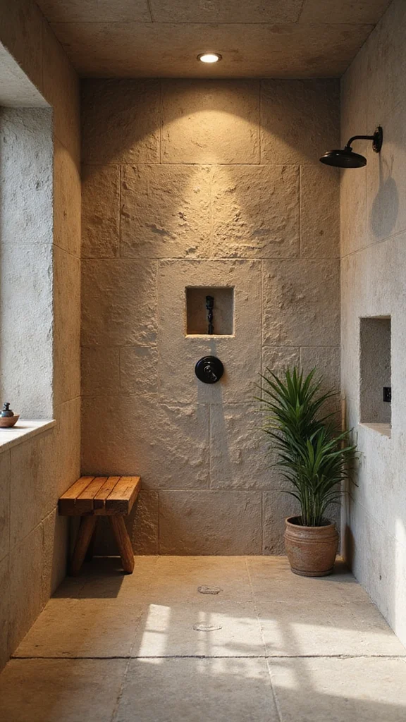 To style your shower with stone tiles, mix different types to create an eclectic look. Warm lighting can enhance the textures, making the colors pop. Consider adding wooden elements, like a teak shower bench, to complement the natural vibe. Keep accessories minimal, perhaps a small plant or a candle, to foster tranquility.