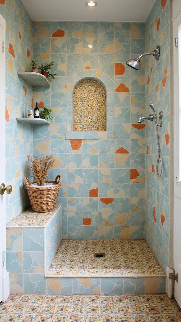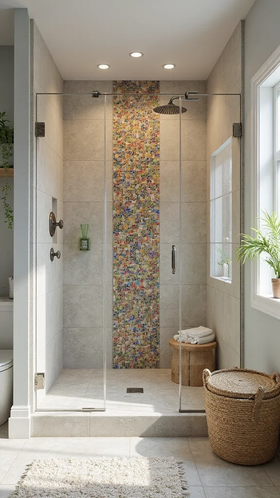 For a playful vibe, mix different sizes and shapes of mosaics. Choose soothing colors, like aquamarine or soft greens, to enhance relaxation. Clear glass fixtures or simple hardware will keep attention on the mosaics. Adding greenery can further promote a serene environment, making your shower feel like a peaceful retreat.