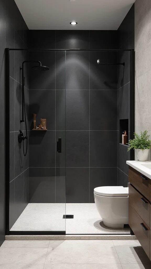 To create balance, consider using black fixtures and accessories that match the tiles. Keep decor minimal, maybe a stylish soap dispenser or sharp-edged shelving, to maintain a streamlined look. Adding plants in matte pots introduces a natural touch while keeping the design elegant and simple.
