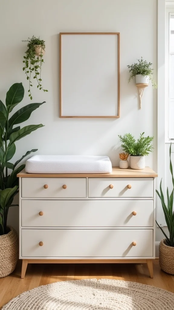 The MALM dresser is not just for storage; it also makes a chic changing station! Place a changing mat on top and use the drawers below to keep essentials organized. You can add plants or colorful wall art to brighten the space. Personalizing the dresser with trendy knobs or handles can tie the whole look together. This dual-purpose setup is ideal for maximizing space while maintaining a stylish appearance.