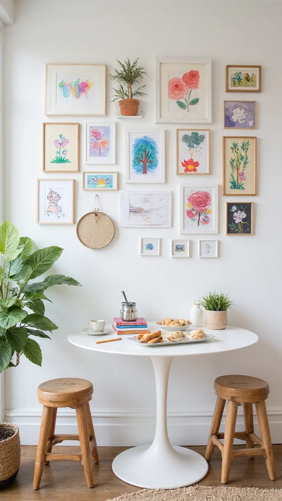 To create a themed gallery, consider adding whimsical art above to set a playful tone. You can also use washi tape for easy hanging without damaging walls. Incorporating a few frames for a polished look can make the space feel complete while allowing for regular art changes.