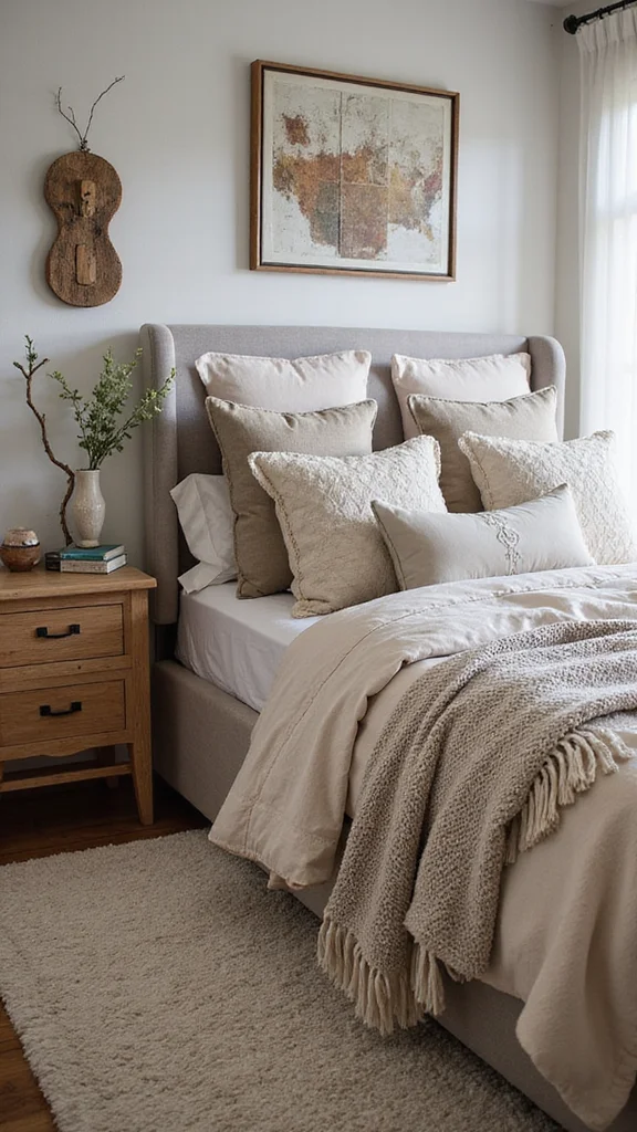 Incorporate earthy tones by painting an accent wall in terracotta or choosing olive bedding. Pair these colors with natural textures, like woven baskets or wooden furniture, to enhance the warmth and charm of your space.