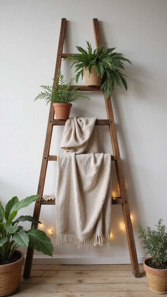 A rustic ladder can enhance your blank wall while serving as a charming decor piece! Lean a reclaimed wooden ladder against the wall to display items like throws, plants, or seasonal decor. This not only adds height but also visual interest, aligning perfectly with a bohemian aesthetic. Adding fairy lights around the ladder can create a cozy corner that draws attention.