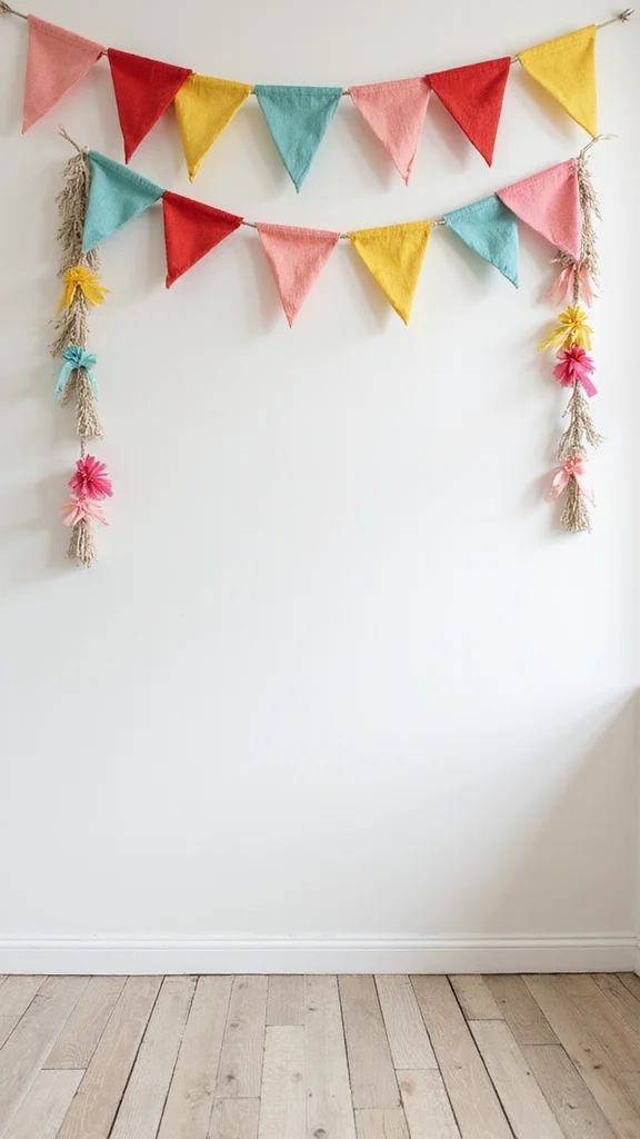 Mix different lengths and shapes for a fun display, and pair them with fairy lights for a magical effect at night. This decor idea is budget-friendly and allows for personal expression, making your space feel unique and inviting. Perfect for bedrooms or play areas, these banners can bring life to any wall.